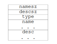 The first two fields of the segment are fairly self-explanatory, they represent the size of both the name and the descriptor. The name field is a string representing the type of note. The desc field is a structure that contains the actual data of the note. The type field tells us what type of note we are looking at. It is an unsigned integer that represents the type of note. It’s worth noting that the name field works as a kind of namespace for the type field. Two notes with the same type field can be differentiated by their name field.